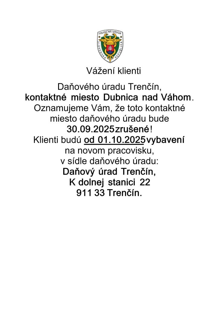 Daňový úrad Trenčín oznamuje, že od 01.10.2025 sa ruší kontaktné miesto Dubnica nad Váhom.