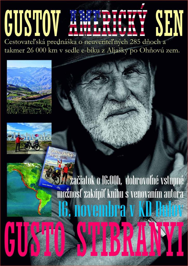 Srdečne pozývame na cestovateľskú prednášku - Gustov americký sen v sobotu 16. novembra 2024 o 16.00 hod. v KD Dulov.