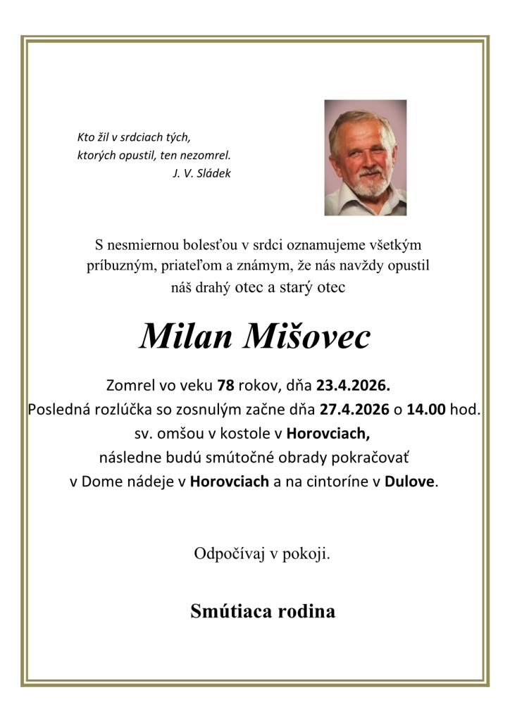 Posledná rozlúčka s p. Milanom Mišovcom bude v pondelok 27. apríla 2026 o 14.00 hodine.