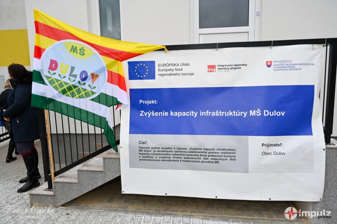 V rámci projektu: "Zvýšenie kapacity infraštruktúry MŠ Dulov" sa vybudovala nová jedáleň s kuchyňou a trieda v MŠ Dulov. Dňa 15.1.2024 bola nová jedáleň s kuchyňou a trieda slávnostne otvorená Ing. Jaroslavom Baškom, predsedom TSK, Ing. Jozefom Šamajom, starostom obce a Máriou Mišíkovou, riaditeľkou MŠ za účasti vedúcej ŠJ, zhotoviteľa stavby, dodávateľa technologického vybavenia, projektanta stavby, poslancov OZ a ostatných pozvaných hostí.